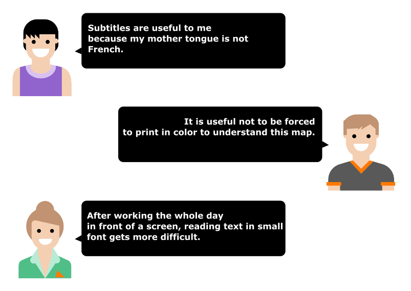 Digital accessibility is about making the access to digital information possible regardless of the nature of a person’s disability and how they consult the information. It involves different technologies such as the Web, videos, Word and PDF documents, but also digital television or mobile phones.