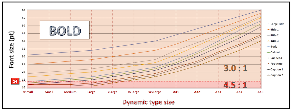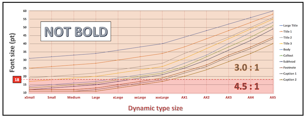With Dynamic Type whose purpose is to adapt the font size according to the user settings, the contrast isn't necessary fixed and must be adapted to the text size.