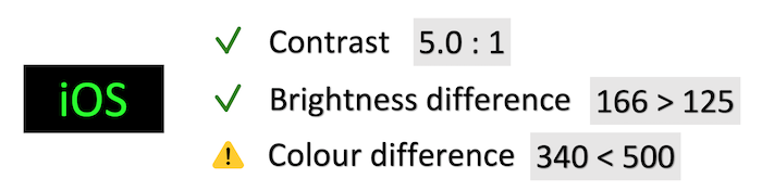The contrast between the colour of the background and the text must be appropriate (can be measured with the Colour Contrast Analyser tool or with the Color Contrast Calculator feature of Accessibility Inspector since Xcode 11).