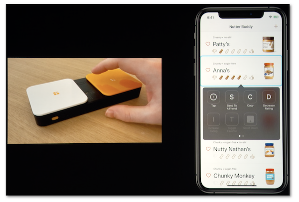 The demo application uses the Switch Control feature on the device that is paired with two switches: the first one (orange) aims at moving the focus to the next item while the second one (white) aims at activating the focused item.
