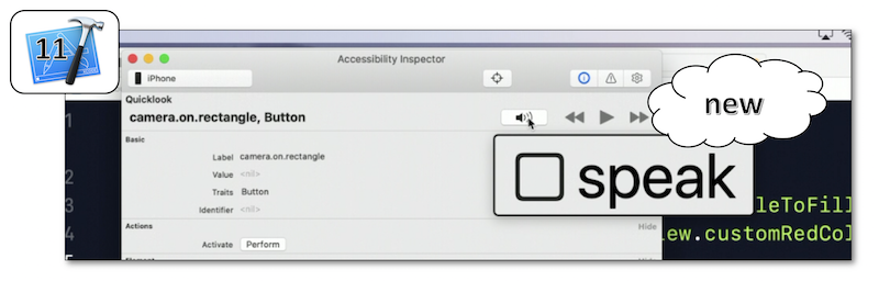 Introduction of a Xcode 11 new feature to vocalize and select elements on the simulator (04:11) after showing the way to get the complete description of a graphic element in conjunction with its selection.