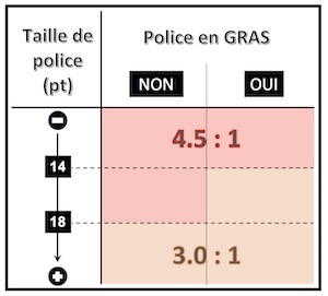 Ces deux éléments permettent de proposer au plus grand nombre une lecture très confortable que seul le contraste ne peut malheureusement pas assurer (voir outil mentionné en fin de section pour calcul automatique de ces valeurs).