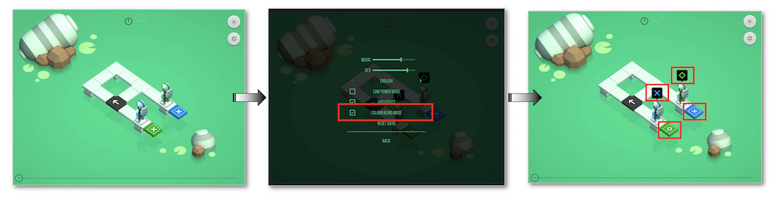 - Différencier sans couleur (UIAccessibilityShouldDifferentiateWithoutColour) : voir WWDC 2019 pour un descriptif de cette nouvelle fonctionnalité iOS 13 et de son accès programmatique possible à partir de iOS 14.