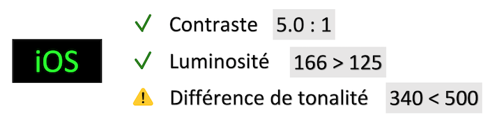 Le contraste entre les couleurs de texte et de fond doit aussi être suffisant (à calculer avec Colour Contrast Analyzer ou avec la fonctionnalité Color Contrast Calculator de l'outil Accessibility Inspector depuis Xcode 11).
