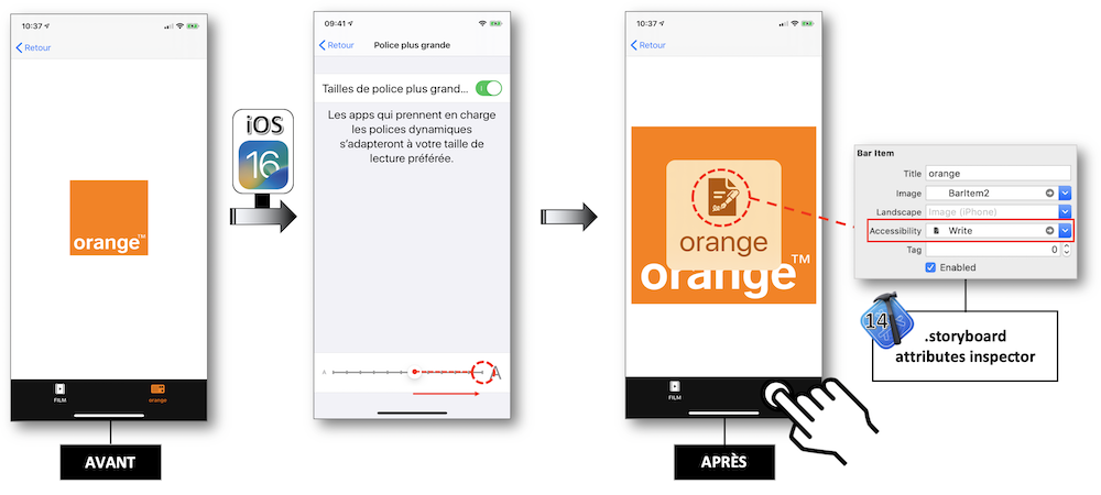 accessibilityLabel : le label permet de préciser le titre spécifique à l’accessibilité qui est lu par VoiceOver en lieu et place du texte du composant si celui-ci en possède un, ce qui permet d’avoir un texte de composant plus explicite que celui affiché à l’écran.