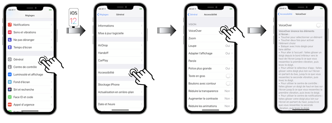 Dans une première partie, nous décrirons les gestes de base liés à une utilisation courante de VoiceOver pour ensuite traiter le cas spécifique de l'iPhone X et finir avec des manipulations peu courantes mais néanmoins très utiles pour l'utilisateur avancé.