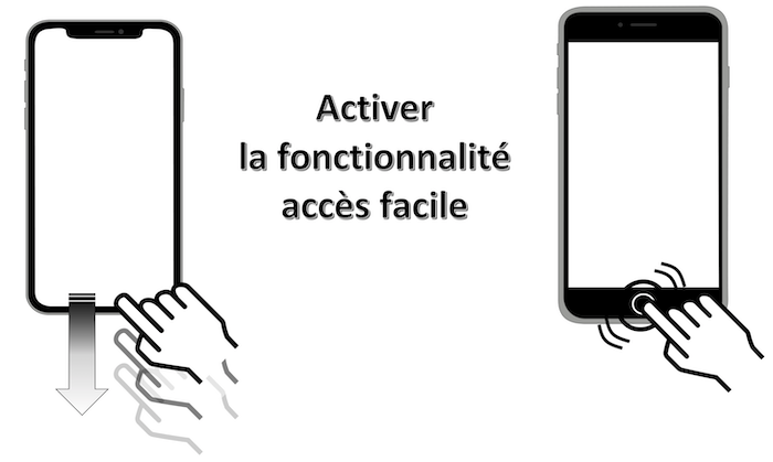 Cette page décrit de façon non exhaustive les gestes spécifiques d'un terminal sans bouton principal présent sur le bas de l'écran à l'aide d'explications textuelles et de schémas permettant de visualiser plus facilement les manipulations à réaliser.
